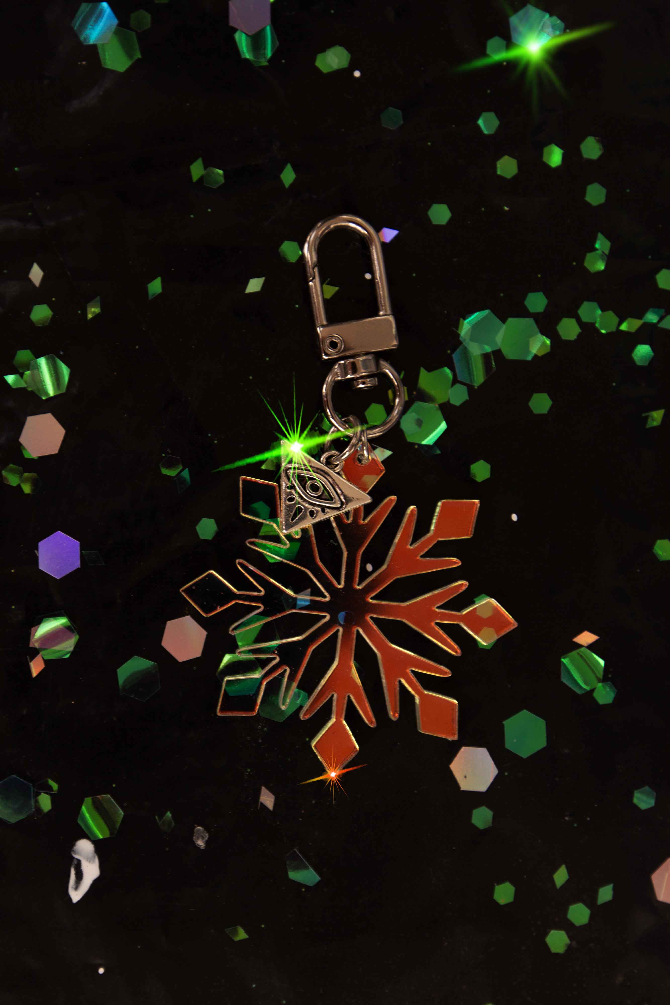 An ultra lightweight holographic acrylic cut-out that sparkles like freshly fallen snow, she refracts all of the colors around her, and her third eye charm will really take you to the next level!!