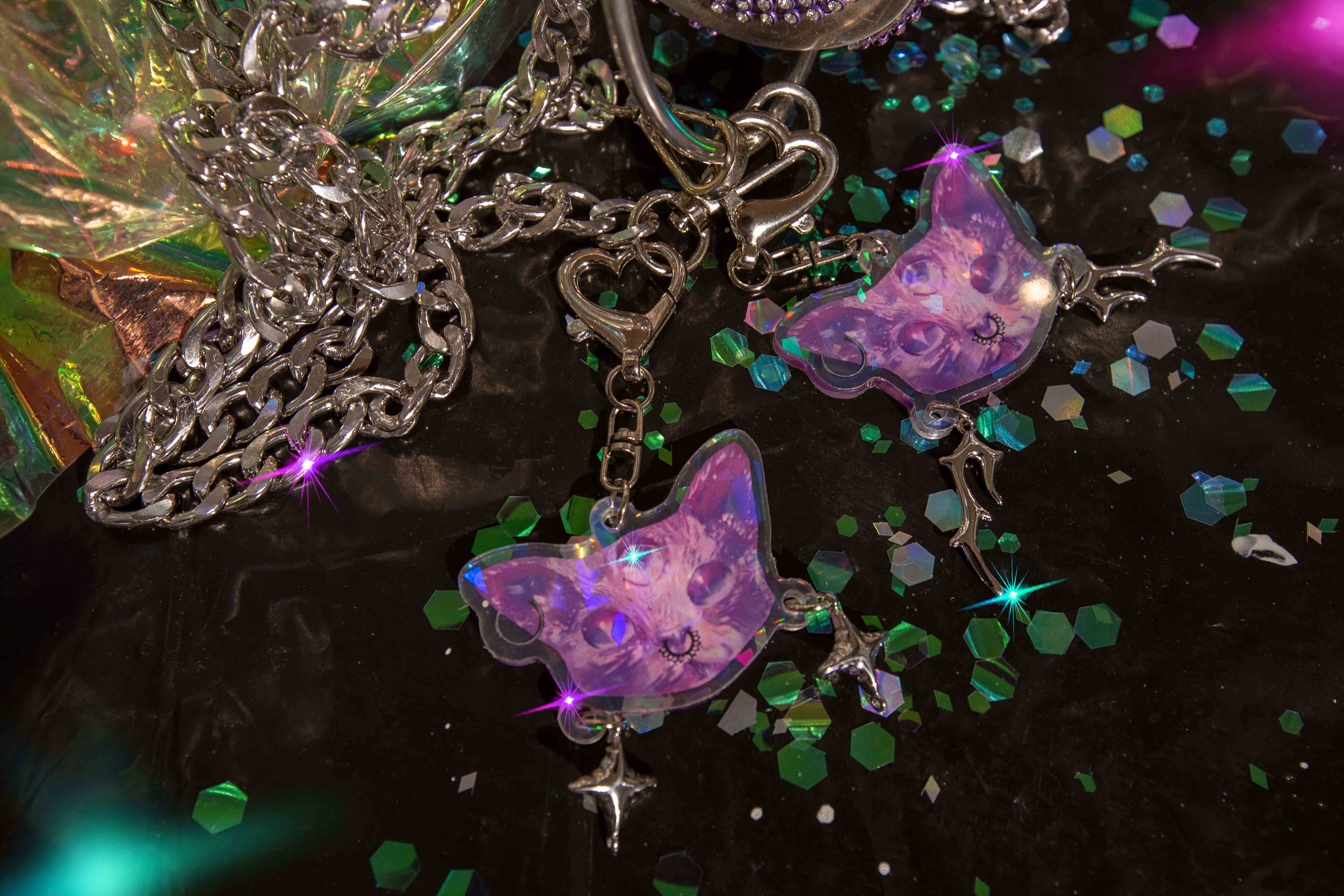 She's a an ultra lightweight double-sided acrylic kitty charm with a third eye, a hoop earring, a cute jewel nose ring... AND she's smothered all over in rainbow crackled holographic glitter!! (insert funny Will Ferrell throwing confetti glitter GIF but irl everyday on your bottle charm) 😏🌈