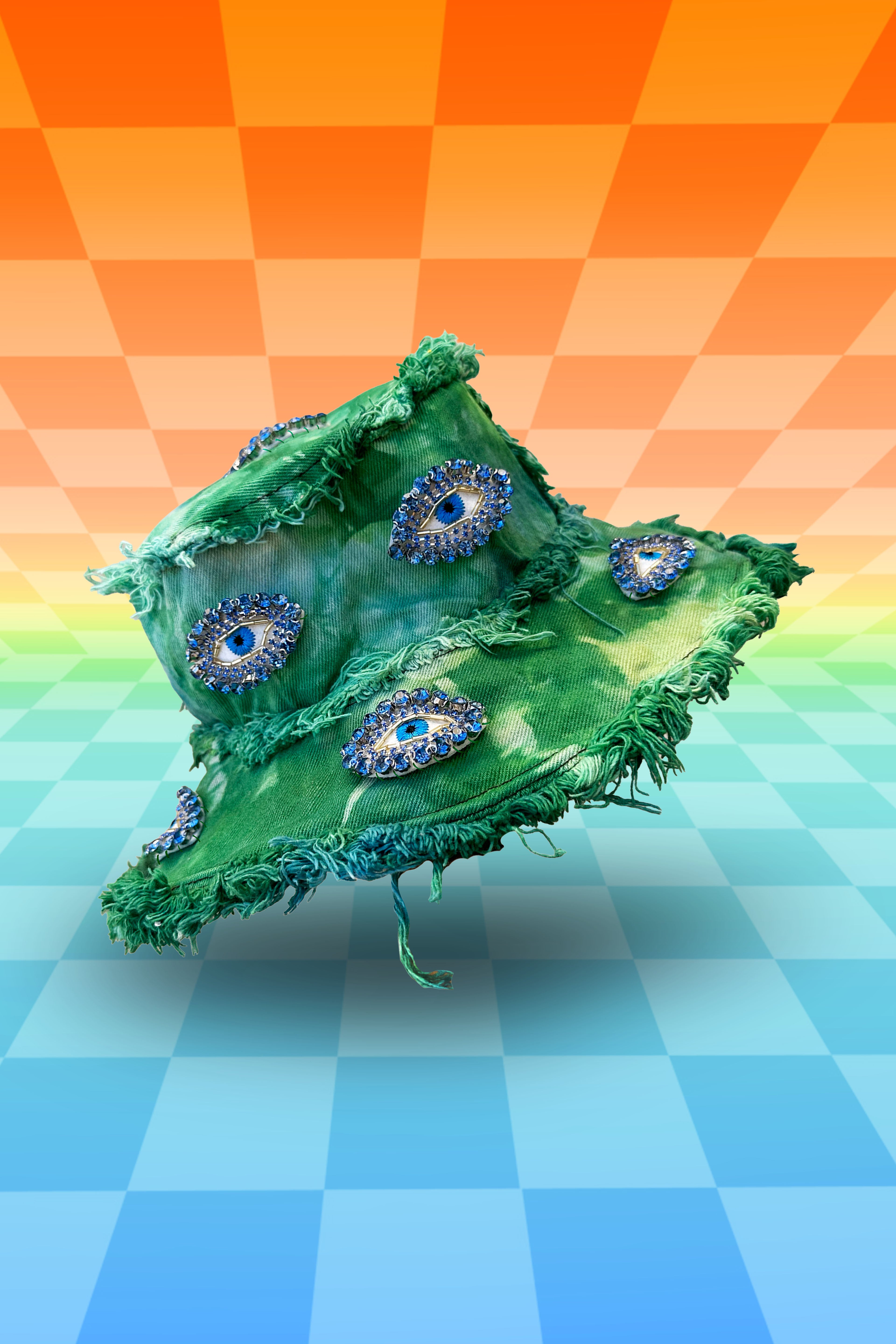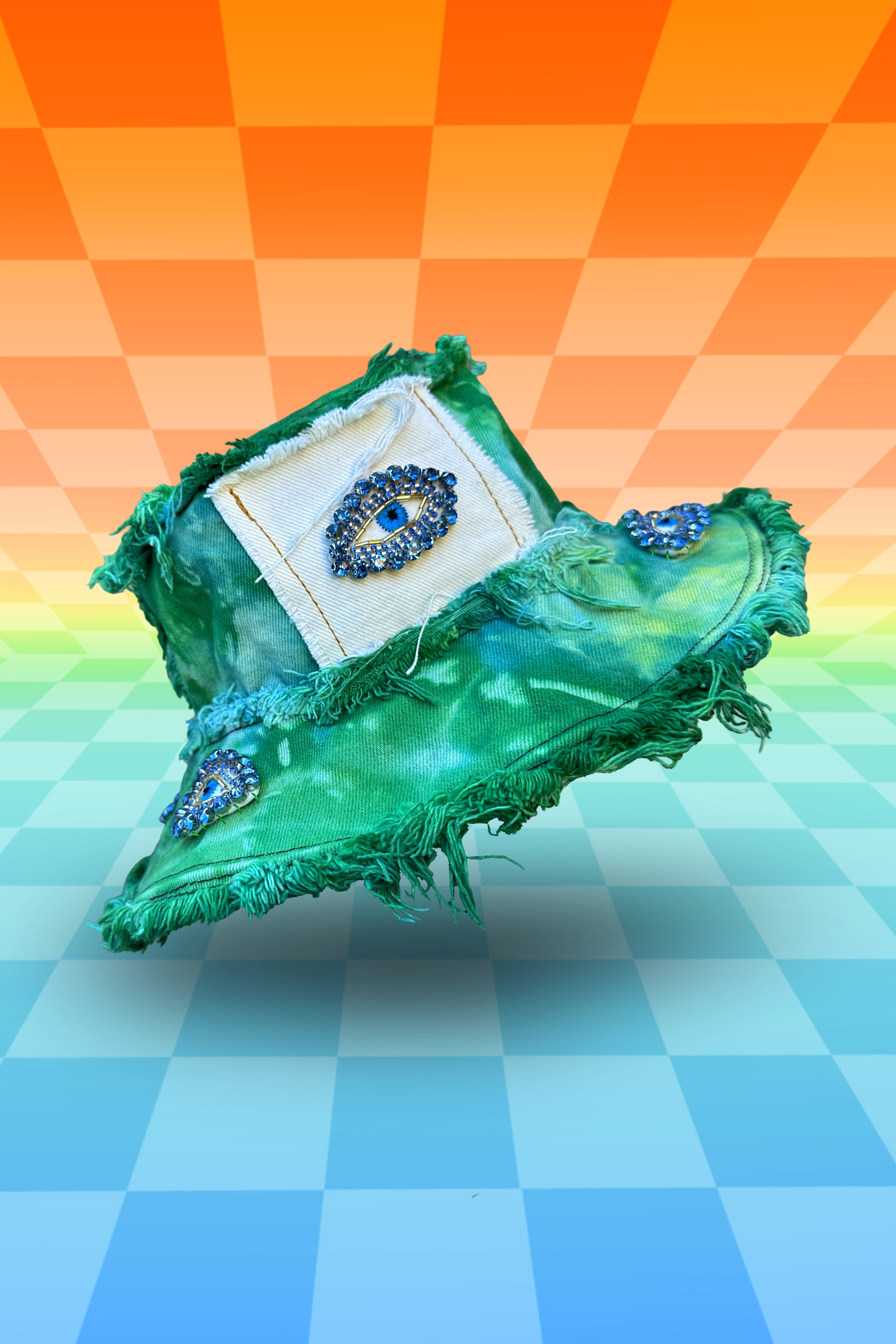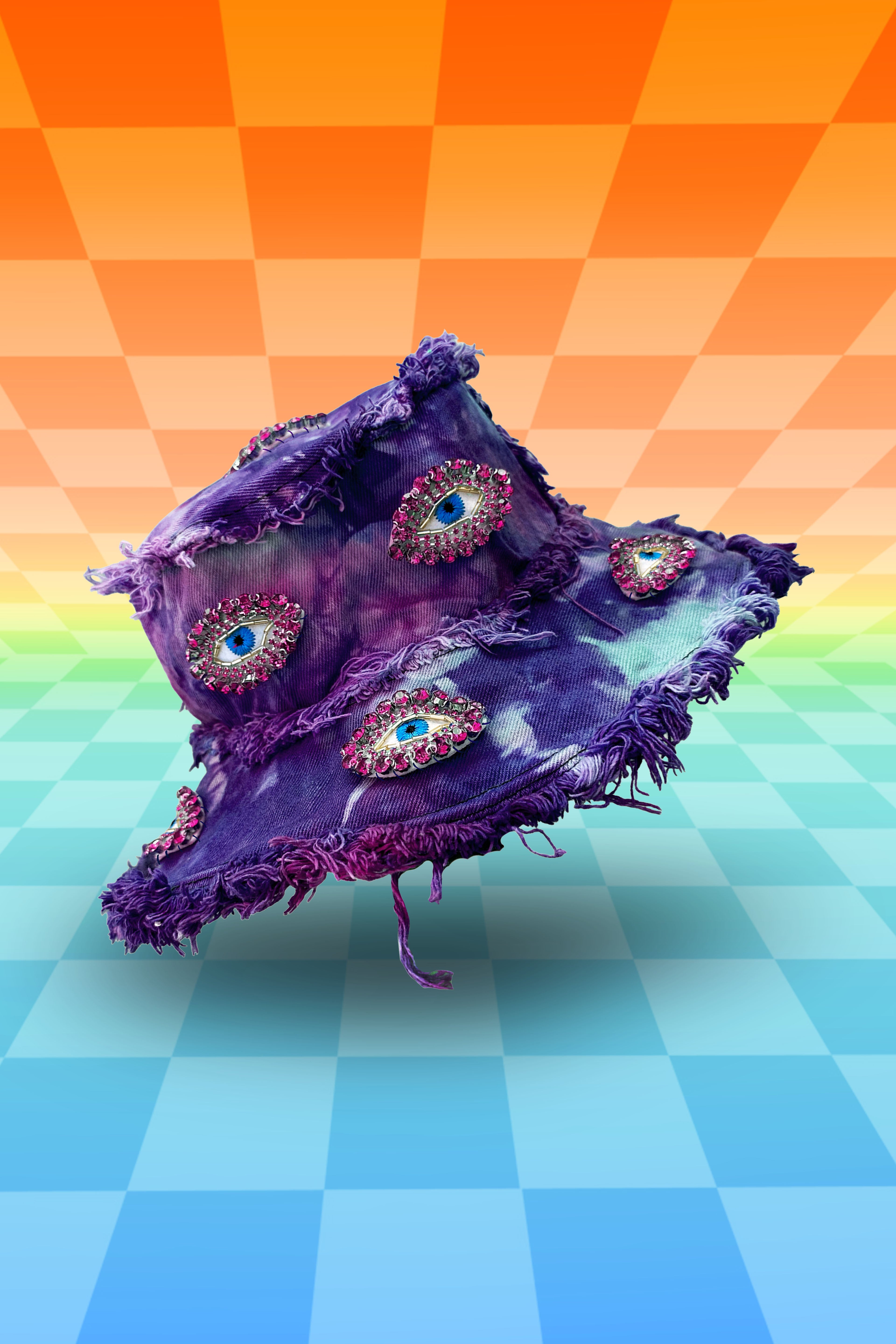 Featuring lil Mini Jewel Eyes all over!! Her base is one of our OG Fade Tie Dye single or double dyed color fade from vibrant to light. Constructed with massively frayed denim edges, & a wire insert through the brim to keep her poppin' all night long!