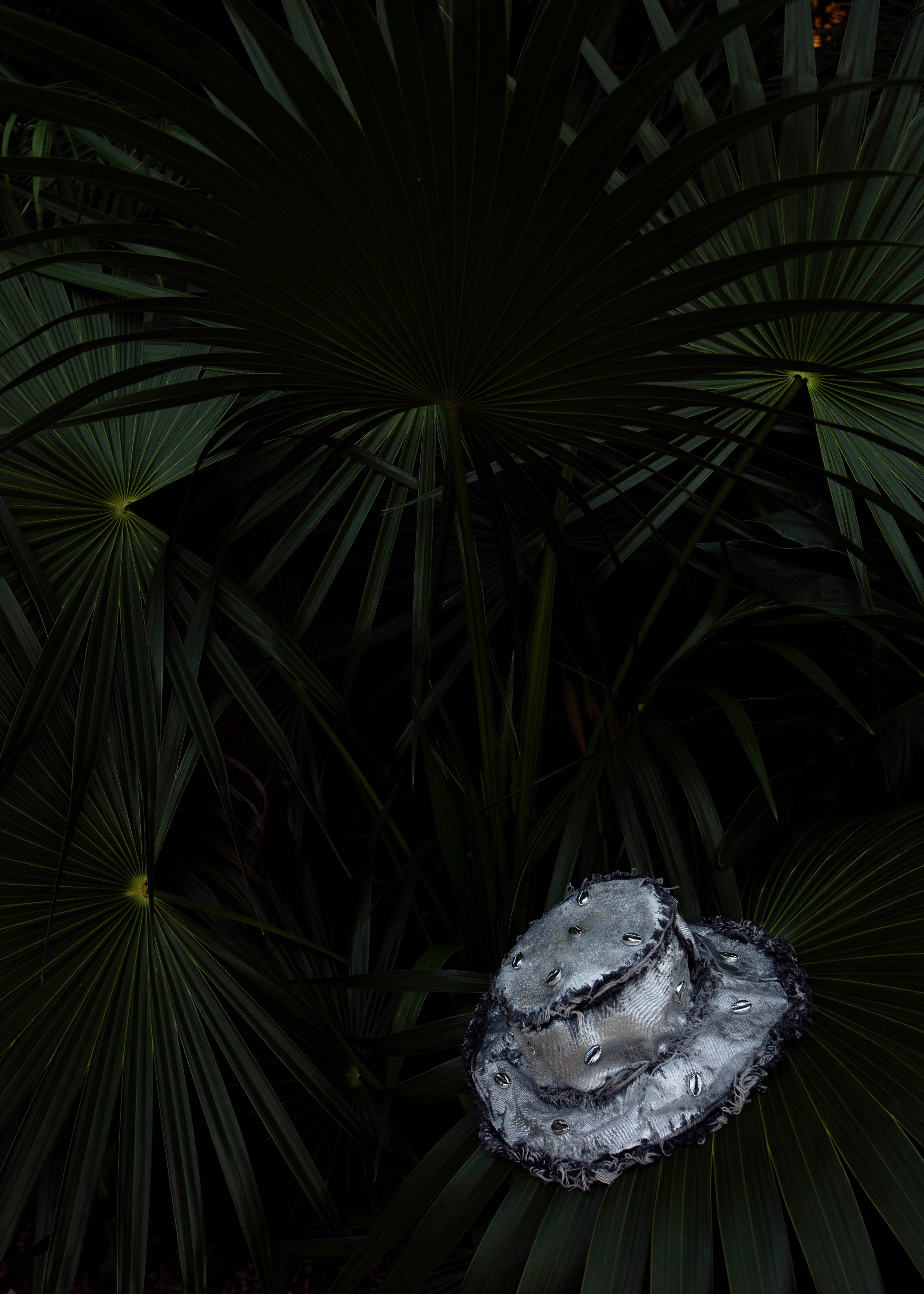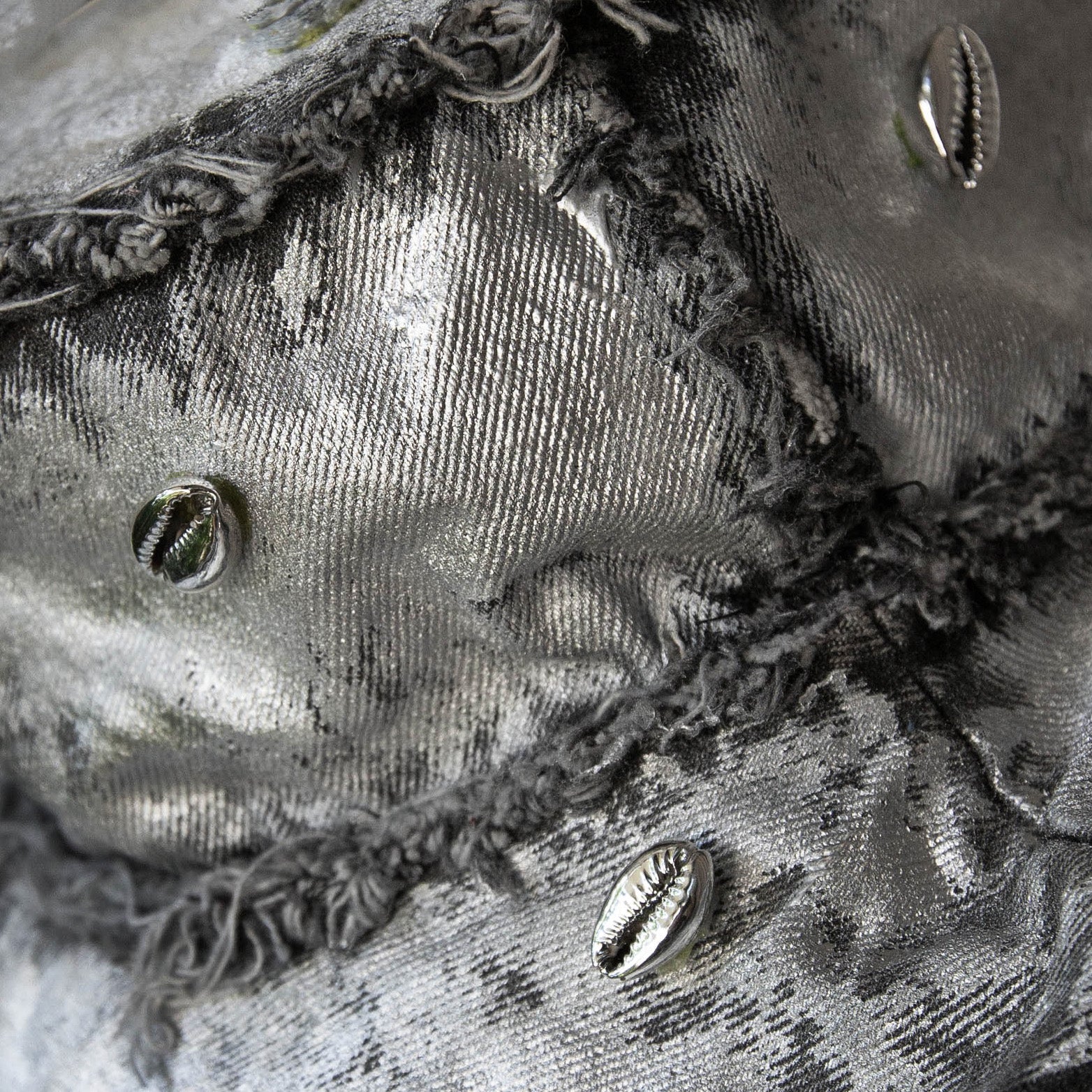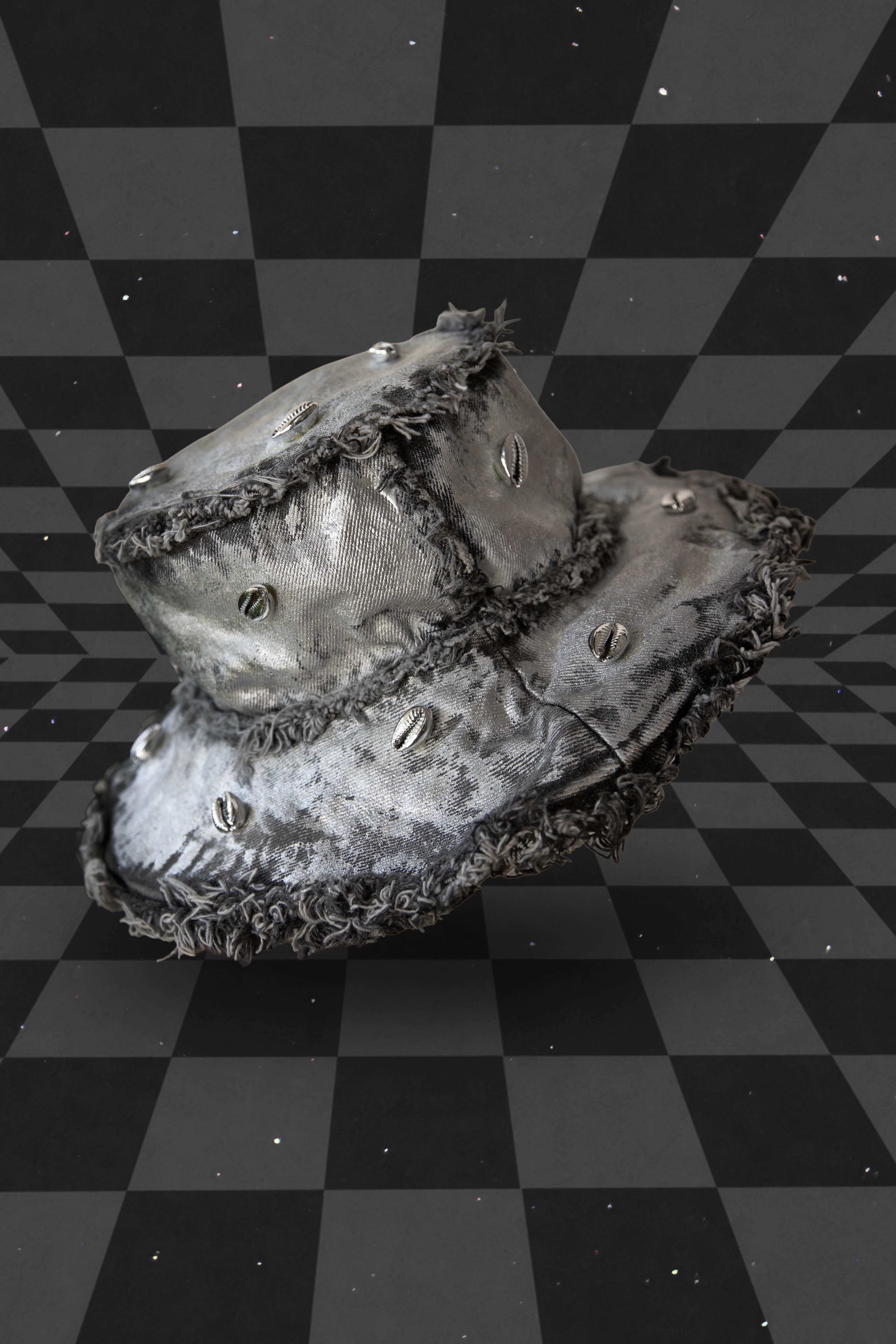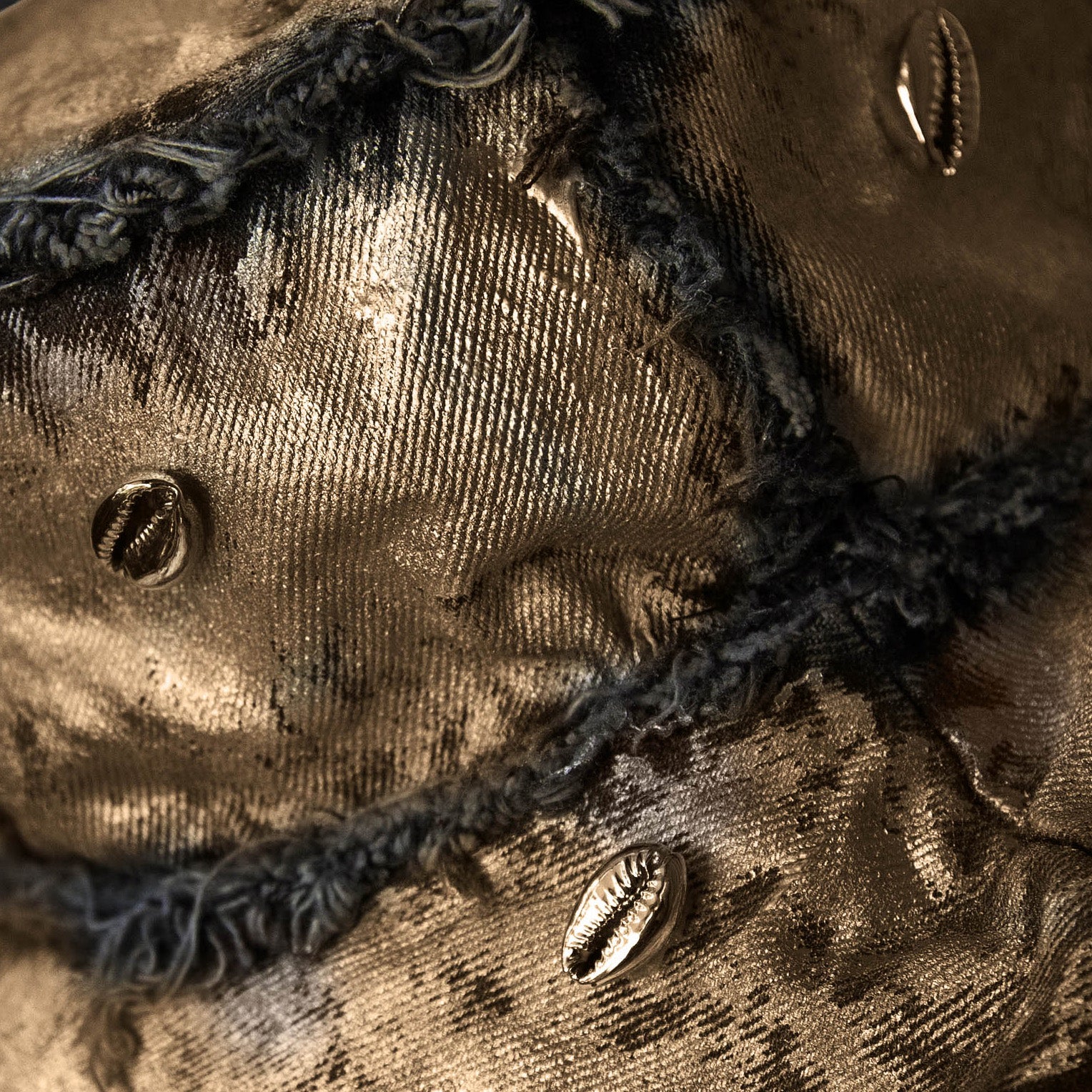 It's giving Grandma Dom... Fully Painted in GOLD or SILVER with conch shells hand sewn all over! Her base is black with painted with layers 'n layers of acrylic paint. Constructed with massively frayed denim edges, & a wire insert through the brim to keep her poppin' all night long!