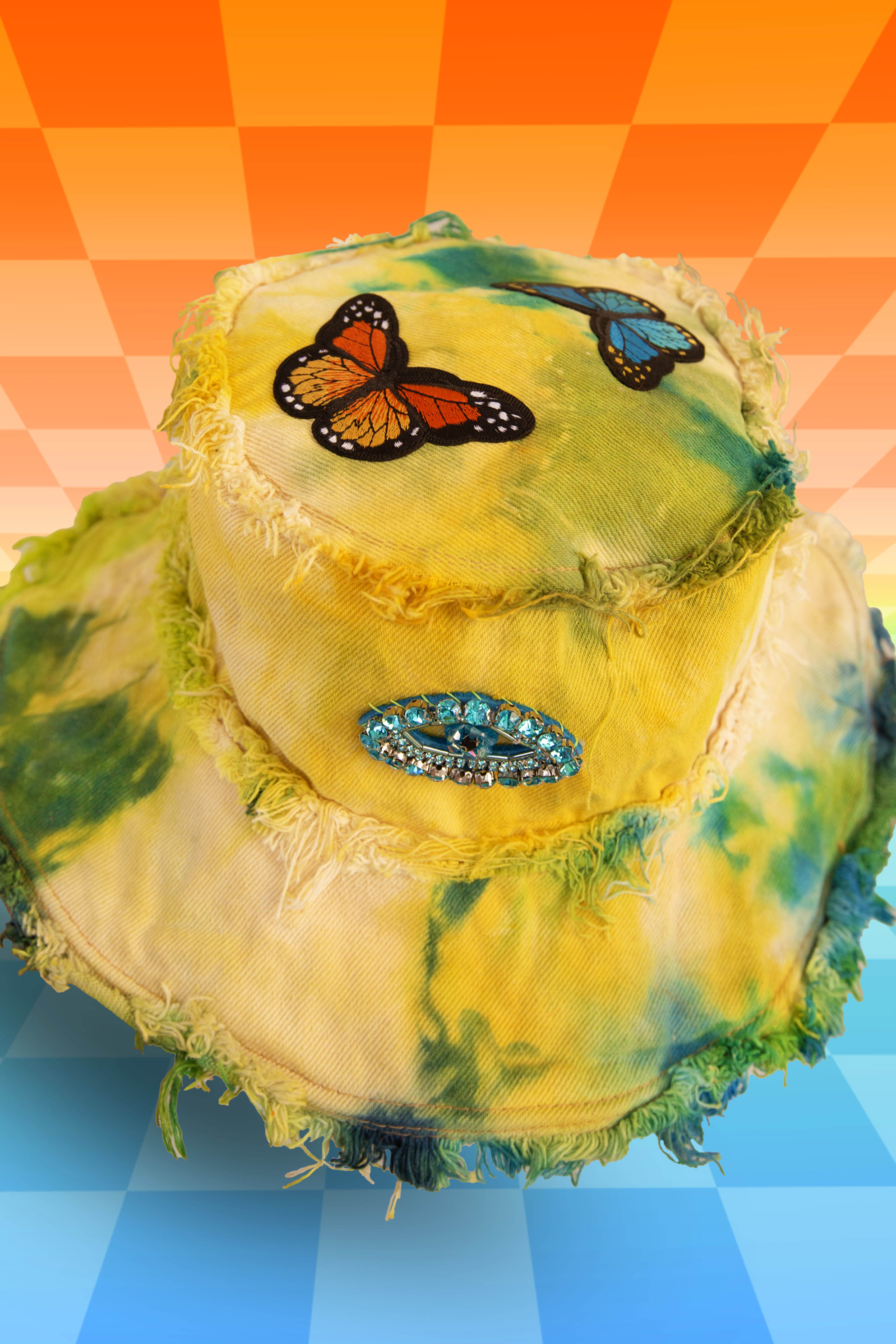 Featuring a 3rd Eye Jewel Patch on the front & back, & 2 dancing Butterflies on the top!! π¦ Her base is one of our Triple Tie Dyes, this means you pick your base color and pops of 2 other colors will be added.Β Constructed with massively frayed denim edges, & a wire insert through the brim to keep her poppin' all night long!
