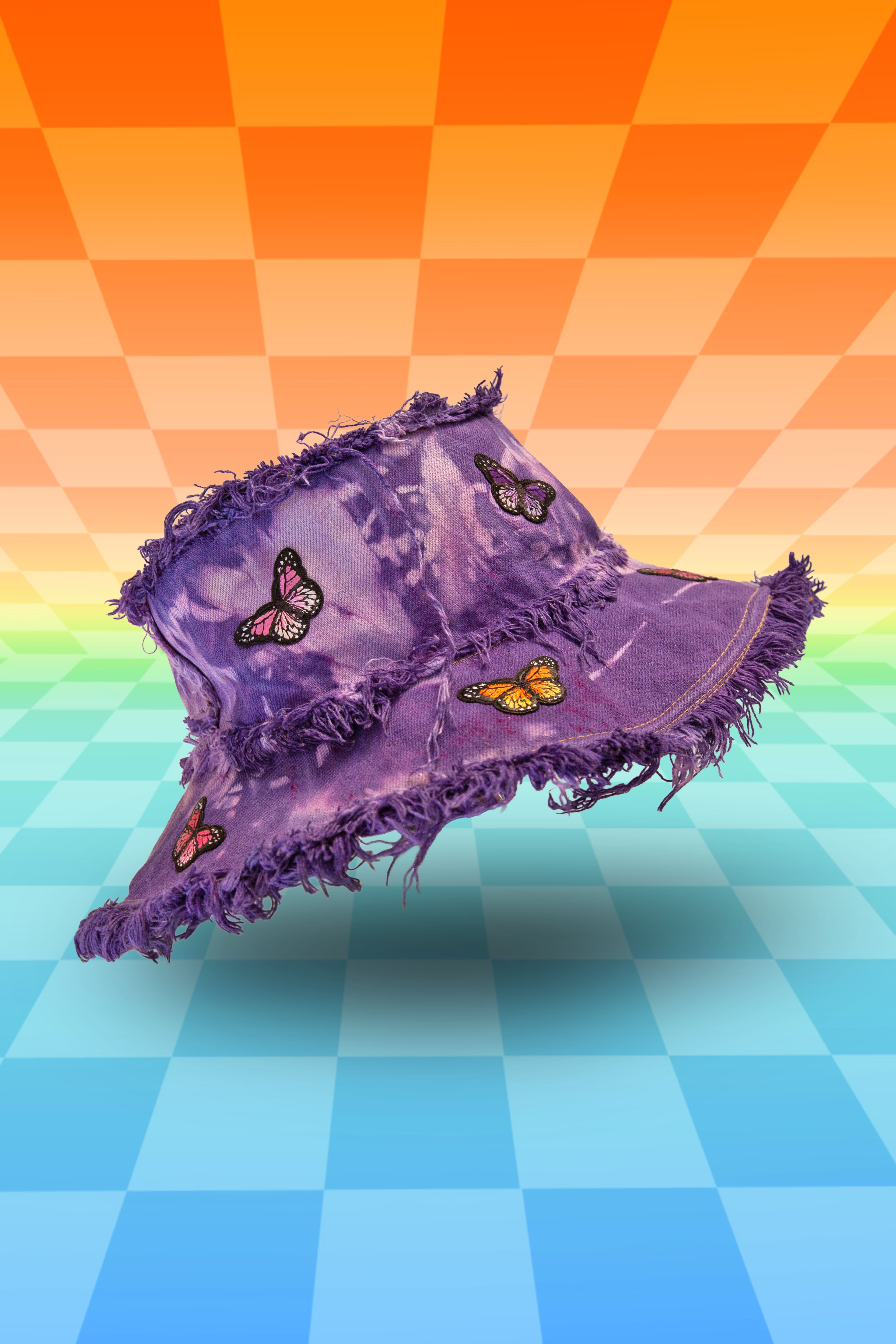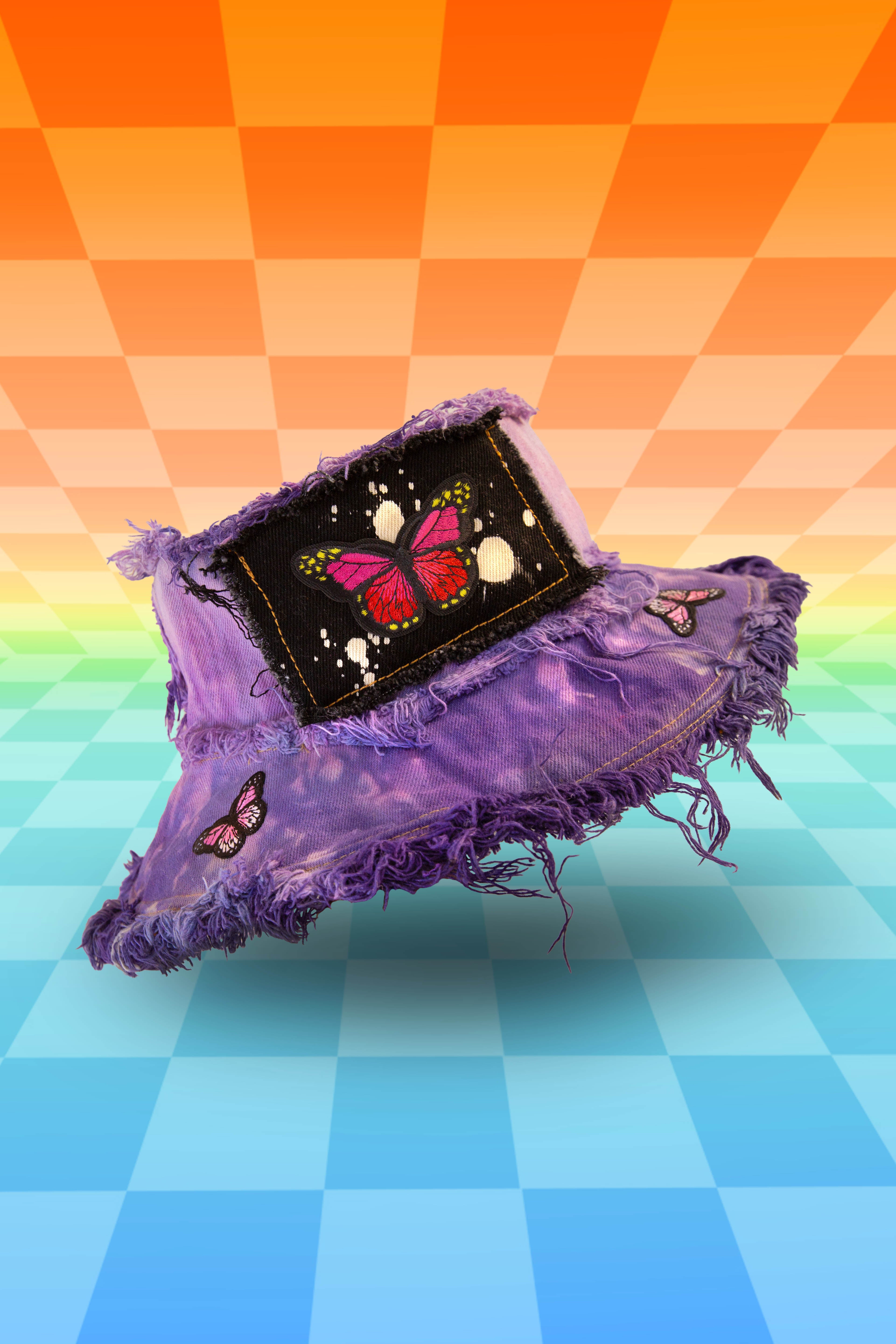 Featuring a front Butterfly patch with a reverse splatter tie dyed pocket and color coordinated butters flying all around!! 🦋 Her base is one of our signature OG Fade Tie Dyes Constructed with massively frayed denim edges, & a wire insert through the brim to keep her poppin' all night long!